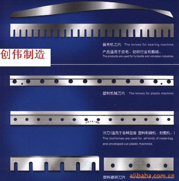 中国定点机械刀具生产厂家 – 昆山创伟模具有限公司 - 生产销售的机械刀片刀具按材料分碳钢高速钢、碳钢、锋钢、镶锋钢、合金钢、不锈钢、硬质合金、钨钢进口材质刀具及其他材料;我司产品依据机械刀具形状的不同分:圆形, 长形, 弧形, 齿形, 异形五种形状;产品广泛应用于陶瓷、印刷机械、造纸、纸箱、林业、橡胶、塑料机械、食品机械、轻纺、电器机械、轻工、铝箔、金属化膜、烟草、卷烟机械、包装材料、BOPP 薄膜、电子电器、边封、中封、底封制袋机、木材加工、食品包装行业、造纸铝箔分切、冶金机电、药材、橡胶 、电线行业、电缆、电线、造船、化纤行业、玻纤、纺织行业、饲料、纸管、林业、木工机械行业、塑料破碎、皮革行业、卷烟等生产各行业标准与非标准机械刀片。我们的企业精神是--诚信为本、质优取胜、精选细做、用户至上、优人优机、用心服务,热忱欢迎全国内外人士来图、来样、洽谈订货。