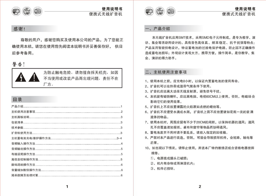 产品说明:应用SMT技术,采用SMD电子元件制成,是专为教学、演讲、集会等活动而设计的。具有音色高保真、频率稳定、抗干扰强等特点;产品采用智能供电设计,特设蓄电池的过放电保护电路,防止因不正确操作造成蓄电池损坏;外观设计美观大方,携带方便,操作简单。是你教学、集会、演讲的得力助手。