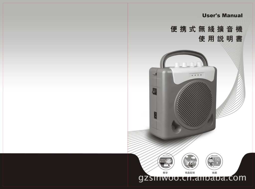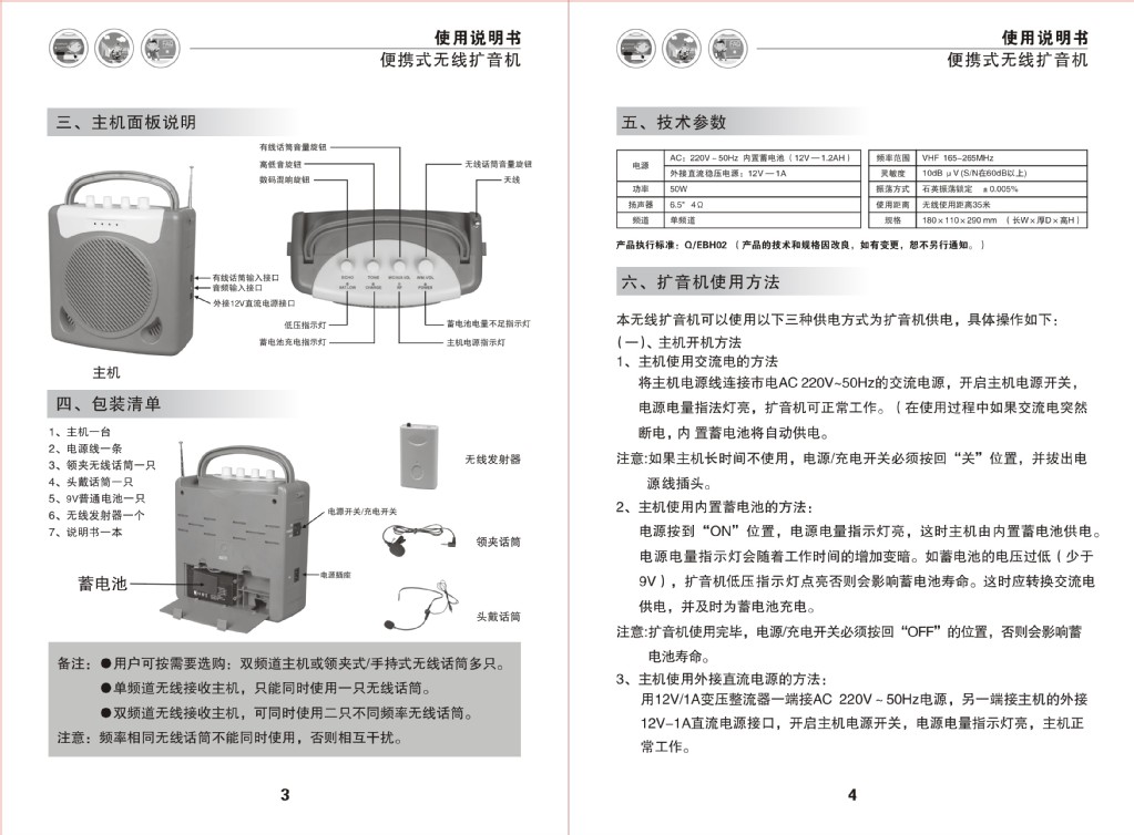 性能参数:电源:AC:220V-50Hz 内置蓄电池(12V-1.2A)外接直流稳压电源12V-1.2A功率:50W扬声器:6.5”4Ω频道:单频道频率范围:VHF 165-265MHz灵敏度:10 dB V9(S/N在60dB以上)振荡方式:石英振荡锁定±0.005%使用距离:无线使用距离35米规格:225*100*125mm