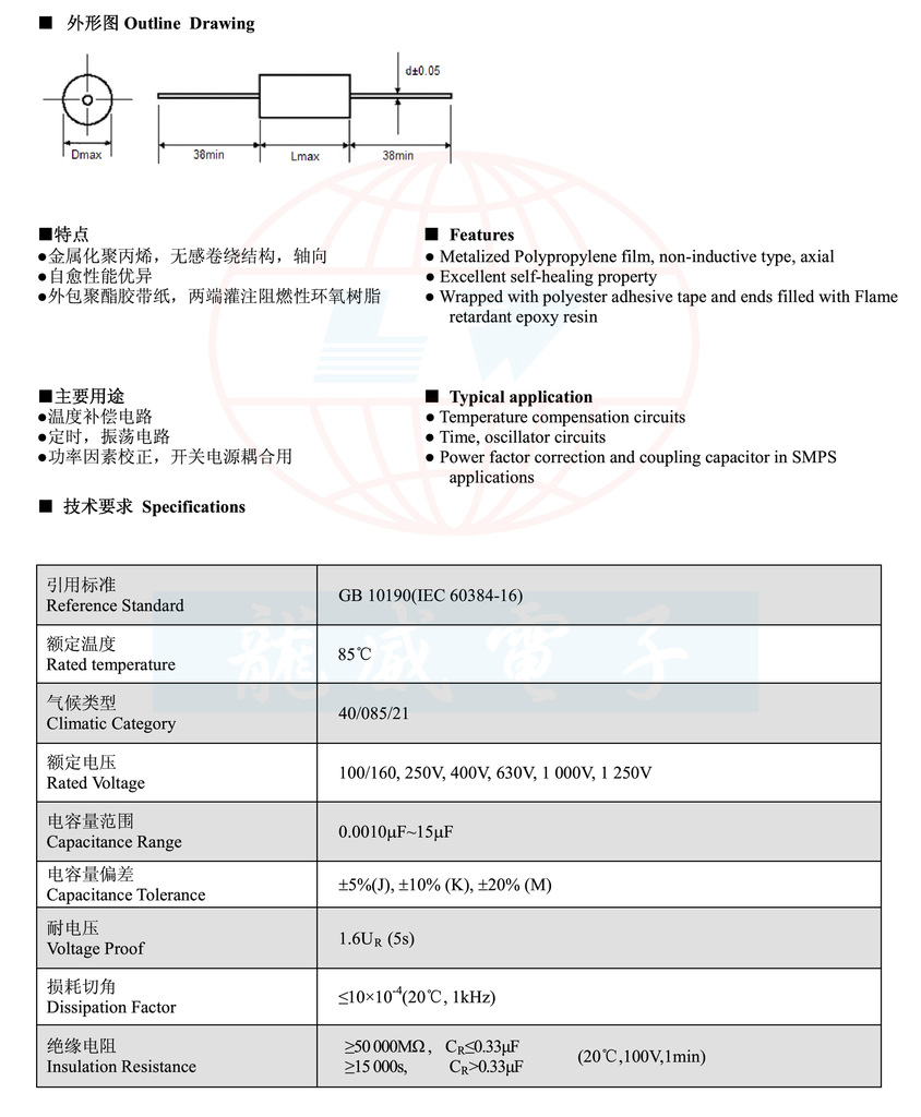 产品全称:金属化聚丙烯膜轴向电容器(圆形)典型应用:广泛应用于高频、直流、交流和脉冲电路中。特点:高频损耗小,适用于大电流。