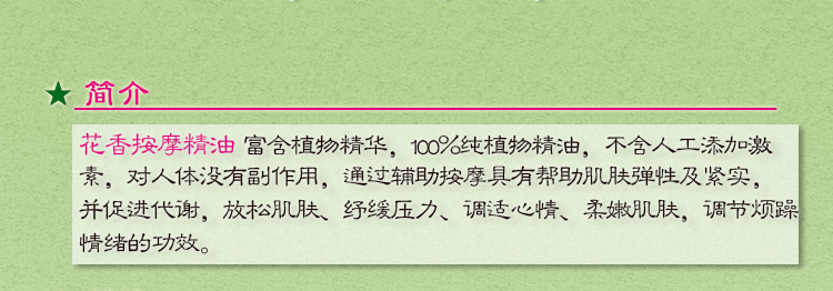 主要从事各类美容美体精油、按摩油、按摩精油、按摩精华素、泡澡泡浴精油等产品的研发和销售。专用于桑拿足浴按摩、推拿按摩、美容美体、SPA水疗、家庭个人等。经过长期不懈努力,已经完全解决了常见按摩油使用后出现的皮肤发干反白问题。我司旗下现有“第5元素”、“油品世家”、“方舟纳米”、“伊甸园”、“伊诺斯”、“伊丽亚”、“伊芙琳”、安吉丽娜”、“简单爱”、“艾瑞丝”等,以及美容美体精油套盒等产品。我们公司运用日本技术,美国原材料研发的新产品爽滑宝按摩精华素相当畅销,中国首款可以吃、食用级BB按摩油,原料美国进口!革命性产品,传统按摩油替代品!神秘配方,颠覆传统按摩油机理,对身体不但无害,还有润肤、嫩肤、护之功效,达到食用级可口吃。新奇、刺激、新花样、新享受!