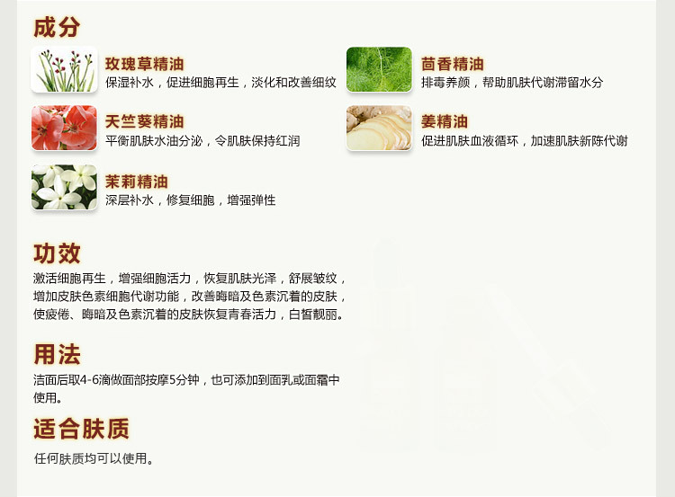 主要从事各类美容美体精油、按摩油、按摩精油、按摩精华素、泡澡泡浴精油等产品的研发和销售。专用于桑拿足浴按摩、推拿按摩、美容美体、SPA水疗、家庭个人等。经过长期不懈努力,已经完全解决了常见按摩油使用后出现的皮肤发干反白问题。我司旗下现有“第5元素”、“油品世家”、“方舟纳米”、“伊甸园”、“伊诺斯”、“伊丽亚”、“伊芙琳”、安吉丽娜”、“简单爱”、“艾瑞丝”等,以及美容美体精油套盒等产品。我们公司运用日本技术,美国原材料研发的新产品爽滑宝按摩精华素相当畅销,中国首款可以吃、食用级BB按摩油,原料美国进口!革命性产品,传统按摩油替代品!神秘配方,颠覆传统按摩油机理,对身体不但无害,还有润肤、嫩肤、护之功效,达到食用级可口吃。新奇、刺激、新花样、新享受!