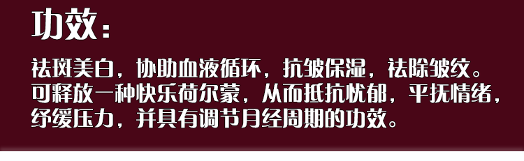 美白,保湿,补水,,丰胸,抗菌,收缩毛孔,排毒养颜,除皱祛纹,放松活络,卵巢保养,改善失眠,促进代谢,抗皱