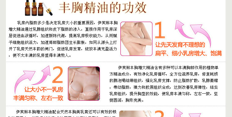ELY158 丰胸挺实精油 功效 促进胸部血液循环,刺激胸部血液循环,刺激胸部穴位经络,使胸部丰满迷人。