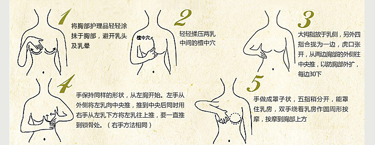 丰胸精油按摩手法步骤四:虎口朝内双掌托胸,涂按摩霜(避开乳晕),往上轻挤乳房50下。