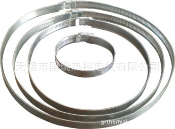 喉卡由不锈钢带和调节螺丝所组成的,它用于防爆电源接线盒、温控器等附件在管道上的固定。安装时钢带可根据管径大小按实际固定长度的1.1倍剪切,再调节固定螺丝即可将接线盒等附件固定在管道上。
