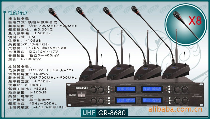 BEIQI GR-8680 是我公司研发的U段会议系列中一款性能稳定,可调频,接收灵活,无死点,防啸叫,有效距离50-80米。