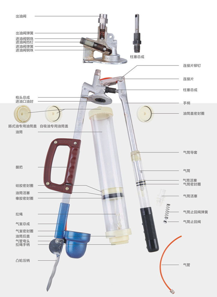 集成优势 —从柱塞泵体到枪头,从杠杆压柄到油筒,从O型圈、单向阀到便携保护盒,