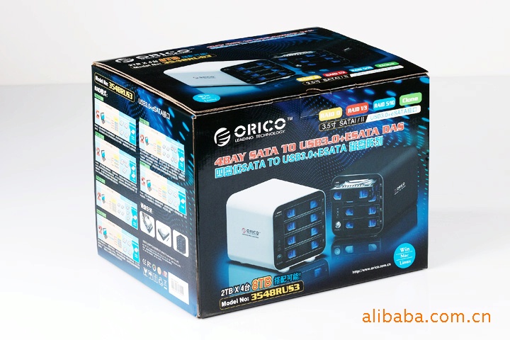 著名电脑周边外设品牌厂商ORICO最新推出一款4bay (4盘位)外置磁盘存储阵列系统,型号为orico 3548rus3, 该产品采用全新铝镁合金无缝设计,合金厚度达到1.5mm.底座还有橡胶防滑处理!orico 3548rus3,外观采用全铝材质,配以黑色和银白色磨沙设计,不会轻易留下指纹,整个产品设计非常时尚却又不失稳重。orico 3548rus3是专门为SOHO族及中小企业的全新设计,支持四颗SATA硬盘(容量高达8TB)、具备进阶RAID设定及热插换功能是多功能的磁盘阵列存储系统,这样的设计和容量非常适合从事设计、研发等需要大量数据存储的用户使用。ORICO 3548RUS3磁盘阵列采用了高容量、高性能的SATA硬盘以及USB3.0+ESATA双主机通道,具有高性能、大容量的特点,提供RAID0,1,3,5,10等RAID模式的资料保护,从此您不必担心因为硬碟损坏造成您宝贵资料遗失,是业界率先采用高速传输USB3.0接口的产品,USB3.0传输速度为5Gbps, 10倍于USB2.0。同时外壳也采用了铝质结构,一方面增加了散热效果,一方面也提升了产品的质感,对于中小企业资料储存备份、SOHO族、影像工作者、高清电影爱好者提供了全新快速的直连存储方案。