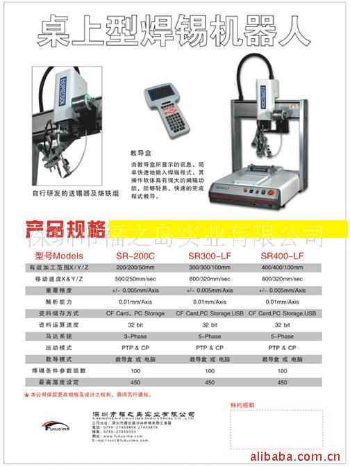 主要特点: 采用示教版搭配圆视化按键编写程式轻松简单,可以选择99个程序,出现紧急情况时停止运行机器人或从运行状态转至示教状态.输入设定参数更安全快捷方便.机器替代手工效力更高, 自动气压式喷嘴/滑轮刷具,送锡速度,锡点大小可调。锡线径0.3--1.2选择。