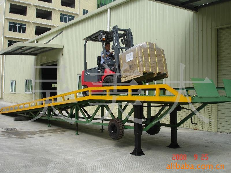 移动式登车桥广泛用于无装卸设备的货台及流动装卸场所,是与叉车配合使用的货物装卸辅助设备。借助移动式登车桥,叉车能直接驶入汽车集装箱内部进行批量装卸作业。只需单人操作,不需动力电源,即可实现货物的安全快速装卸。
