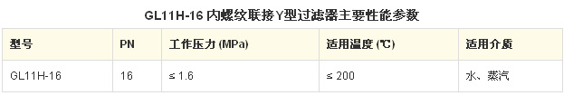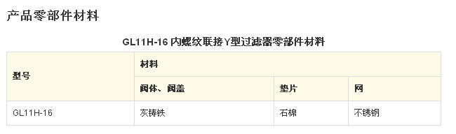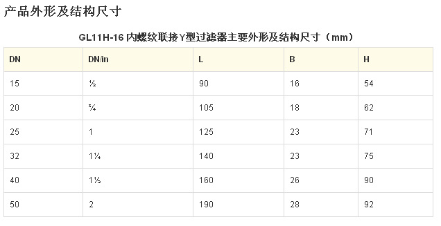 GL11H-16 内螺纹联接Y型过滤器:阀体材料为灰铸铁,主要应用于口径较小的管道设备,连接拆卸方便,排污性能可靠,经济适用。是输送介质的管道系统不可缺少的一种装置,通常安装在减压阀、泄压阀、定水位阀等水力控制阀或其它设备的进口端,用来清除介质中颗粒性杂质,免受因管道内杂质、铁锈、焊屑等带来的堵塞和损坏,从而避免了维修费用和生产损失,保护阀门等设备的正常使用。采用不锈钢双层网结构,坚固耐用,具有结构先进、流阻小、排污方便、纳污量大等等特点,主要用于水、蒸气等介质。当需要清洗时,只要将可拆卸的滤筒取出,去除滤出的杂质后,重新装入即可,使用维护极为方便。可根据客户需要设置过滤网的目数。