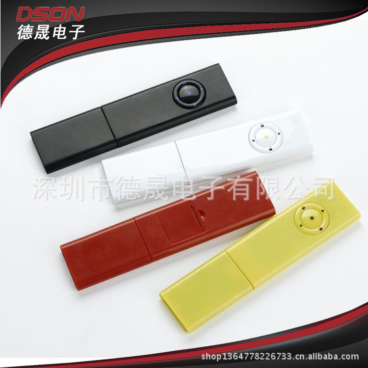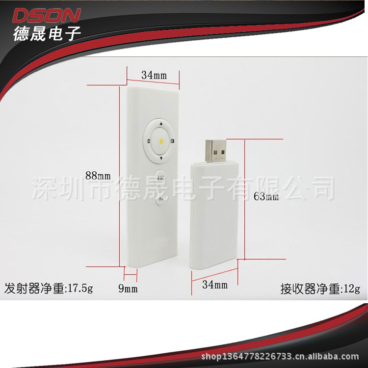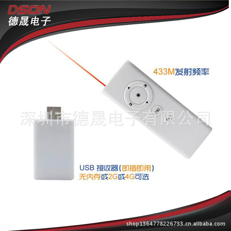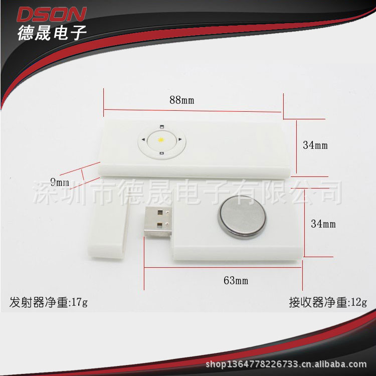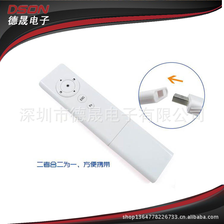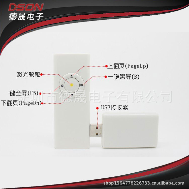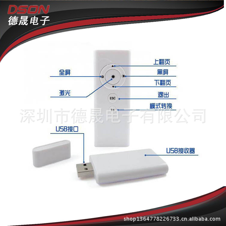 德晟DS-103多功能鼠标翻页激光笔 详细说明: A特色功能 无线鼠标 上下翻页 激光教鞭 一键播放 黑屏 外形小巧美观 B.基本描述 翻页激光笔DS-103有两种工作模式------演示模式和鼠标模式,它包括两部分,发射器和USB接收器 C.功能介绍 1.演示模式(Fn可以在两种模式间切换) 2.鼠标模式 D.技术参数 发射器 遥控方式 RF/无线电射频技术 发射频率 2.402GHz RF输出功率 0dB 遥控距离 不小于15m 激光功率 <1mW or 5mW <1mW 波长 630-680nm 工作电压 3V 休眠电流 1uA 电池 1*CR2032 尺寸 32*87*8mm 重量 17g 接收器 接收频率 433.92Mhz 接收灵敏度 -90dBm 操作系统 Windows98/Me/2000/XP,Mac OS,Linux USB 版本 USB2.0 兼容 USB1.1 尺寸 32*63*8mm 重量 11g E.适用的操作系统 Windows 98/Se/Me/2000/XP或更高级别Windows操作系统 ,Mac OS, Linux F.安装使用 1.将USB 接收器接到电脑可用的USB 插口上。 2. 第一次使用系统会自动查找硬件并完成安装。(注:Windows98/SE 操作系统需要Win98 光盘,在第一次使用时 电脑会提示, 完成安装,以后使用不需再次安装) G.注意事项 1. 请不要把电池装反; 2.请不要将用尽或损坏的电池留在本产品里; 3.长期不使用本产品,请将电池取出; 4. 第一次使用系统会自动查找硬件并完成安装。 5. 当本产品无功能或遥控距离缩短时,请更换新的电池。 6. 为方便用户使用,本产品在出厂前已对码,每套产品具有唯一码,请勿与同型号产品的发射器和接收器互换,否则不能正常工作。如发生混淆请与当地经销商联系!