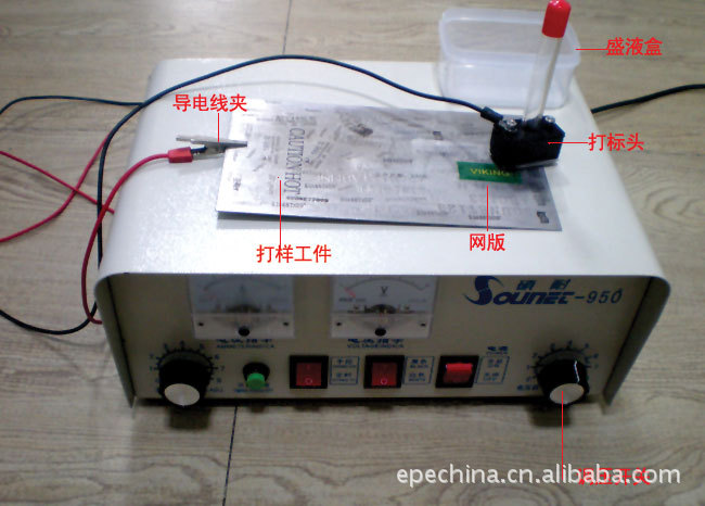 该设备是应用电化学原理在多种金属上打印标识不锈钢、碳钢、各种合金钢、工具钢、硬质合金、铝合金、各种镀铬、镀锌材料、各种磨削、抛光金属表面等,适用于打印徽标、产品名称、技术指标、厂商名称、安全事项、以及制作高档不锈钢标牌,外壳打标等。