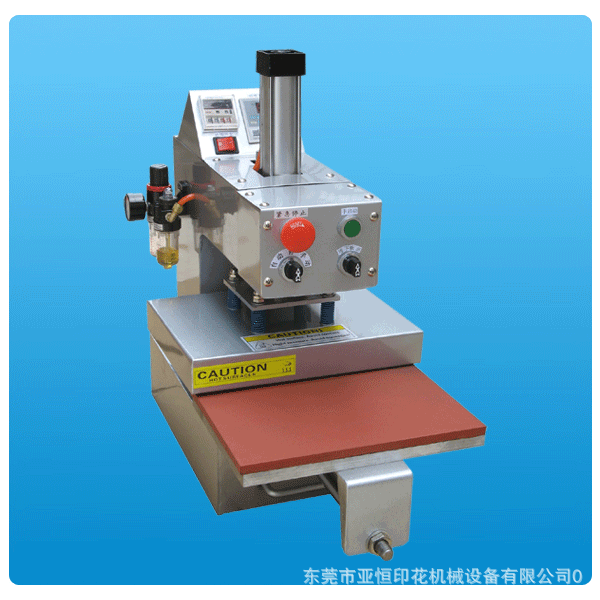 维修:1.气压:如压力不够或太大,可调气瓶上调压阀,向(+)方向加大压力,向(一)方向减少压力(请注意气瓶是否有润滑油)。2.温度:当设备定温度后发热板不发热或发热不匀,应检查电路温控器和热电偶,如热电偶断,则温控器上有一个断线指示灯亮,则应更换热电偶。3.时间:当开关至“手动”时,按动“手动启动”不会下压则检查“手动”开关,当开关至“自动”时,台板到位时不会下压,应检查箱内微动开关接触点是否到位,如不们位则应该调整。4.如出现质量问题,请及时与本公司联系。 技术参数电压: 220V/110V温度: 0-399度功率: 2000W时间: 0-99小时工作台尺寸:(38*38CM) (40*40CM)(40*50CM)(40*60CM)(60*80CM)重量: 125KG本机可将升华类,溶剂类油墨的采色图案与文字经热转印在棉、麻、化织等织物上,还可进行植毛烫画和发泡印花工艺等热处理。方便实用!