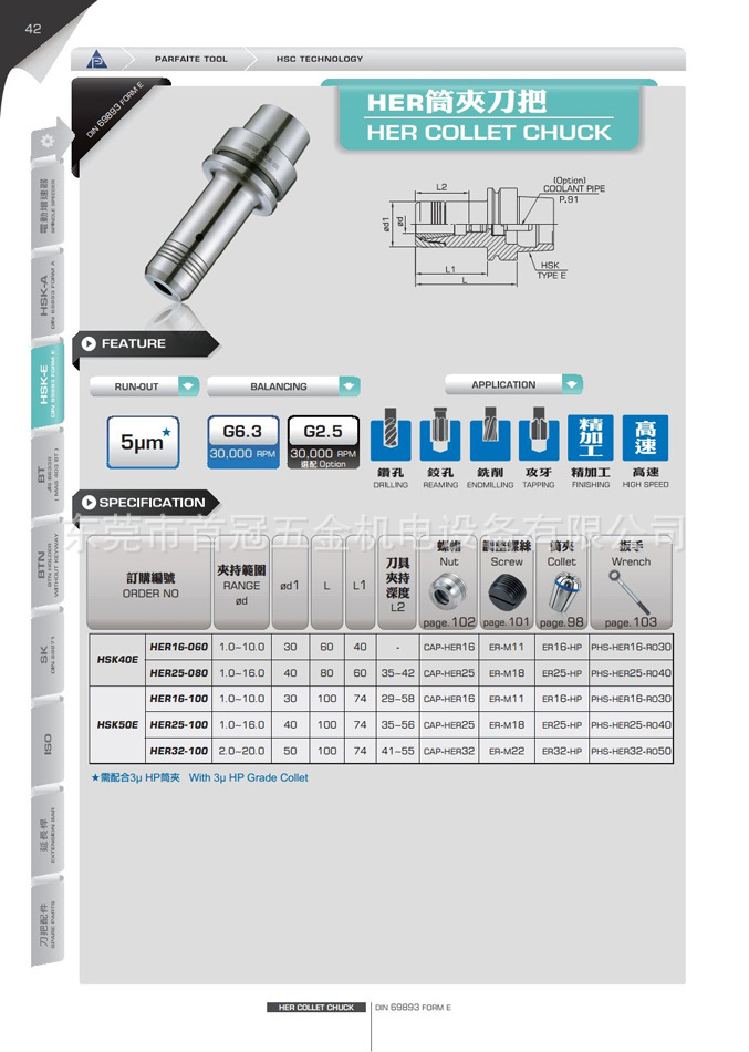 4.不论BT SK CAT锥柄类型的HER筒夹刀柄均在出厂前,做动平衡休整,在高速时,精度依旧稳定。