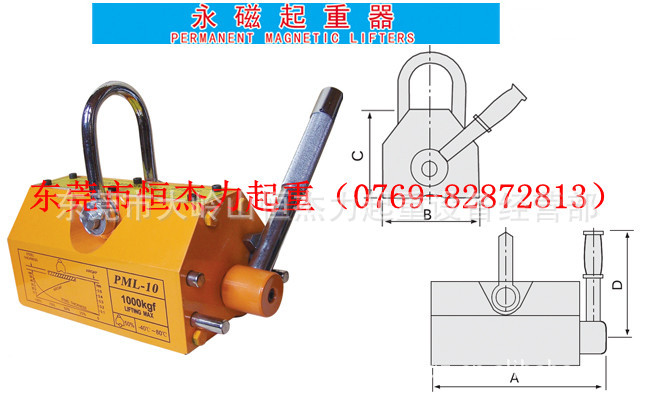 PML永磁起重器也叫磁力吊, 具有体积小,自重轻,吸持力强的特点。永磁起重器采用独特的磁路设计剩磁几乎为零,拉脱力是额定起重力的3.5倍,在起重器的手柄开关处附有安全钮,可单手操作,安全方便。独特的V型槽设计,可起吊相对应的圆钢、钢板。
