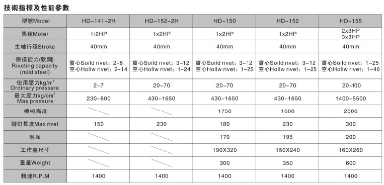 1、整体机身钢性强,无振动、无噪音。2、主轴可高低调整,扩大了铆合范围。3、配合客户的要求之电压。4、最大铆合能力为Φ4mm