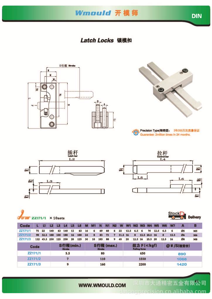 主营产品:模具日期章,锁模扣,限位夹,气顶,定位块,模具计数器,二次顶出机构,复位机构,辅助器,冷却棒,止水栓,喉塞,快速接头,隔水片,导柱导套,斜顶滑座,侧抽芯装置,唧嘴,顶针,司筒,弹弓顶针,定位珠,树脂开闭器…