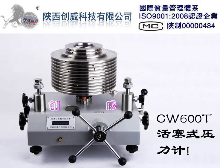 CW-60T型活塞式压力计  主辅机一体式活塞式压力计 新规程活塞式压力计 (碳化钨 标准型) 获得英国QAIC国际认证。截止目前,成为我国压力、温度计量行业首家通过新版本国际质量管理体系ISO9000/2008认证的生产企业,证书注册号:/71418-C 获得国家知识产权局颁发专利证书,专利号:ZL2009 2 0031895.X 我公司新规程活塞式压力计系列产品,分别通过了中国计量科学研究院、中国测试技术研究院、西北国家计量院、机械部压力检测中心等国家权威机构测试,均取得产品《检定证书》,技术指标完全优于国家规程要求。一些硬性指标完全优于0.005级的要求(详见《证书》)。 ●两个被检表接头处设计有两个截止阀,截止阀能及时关闭被检系统之间的压力。由于活塞式压力计在加减砝码时,必须减压将活塞降下来,而被检精密压力表、压力变送器、传感器等和系统之间若不能被截止,表中的压力会随着活塞升降而升降,则考核不出被检表的回程误差,就不能符合精密压力表、压力变送器、压力传感器等检定规程的要求和耐压检定的要求。 ● 活塞和活塞筒经精工研磨,其圆度误差和间隙极小,因而极大的提高活塞转动延续时间,也就相应减小活塞下降速度,提高活塞鉴别力。 ●特意设计的压力转换阀,在关闭时,可不用砝码单独工作,即活塞压力计台子可作为压力泵或压力源独立使用。 ●活塞工作位置采用位移传感器监测,双排液晶数字光标显示,具有灵敏、醒目、准确的优点。 ●砝码已经进行压力形变系数和当地重力加速度的修正。●可选配数字显示功能:温度、位移、时间、转速、压力等参数的数字显示 ●测量范围:名义标称测量范围与实际测量范围一致 ●活塞系统可以方便拿出送检(不用携带沉重的主机台) ●可作为传递用检定活塞式压力计;也可高精度测试用。可配kg砝码和Mpa砝码 ●加压系统先进,轻便耐用! ●砝码采用挂篮结构,重心低,稳定性极好。 ●同时检定两只被检表,采用快速压力接头,绝无漏油现象 ●每台均出具中国计量科学研究院或中国测试技术研究院《检定证书》 主要技术指标: 型 号: CW-6T 、 CW-60T 、CW-250T、 CW-600T 、 CW-800T 、 CW-1000T 、CW-1600T 标称范围/测量范围: