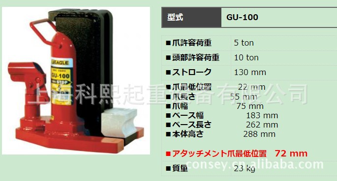 日本鹰牌(EAGLE)生产的千斤顶在日本国属于重工业级产品与防灾害救援产品属于高品质一级液压工具,EAGLE大部份产品的特点为,材质优、做工细、寿命长、安全级别高。可应付各种环境施工、针对于土木、设备搬运、精密仪器安装大大提高了工作的效率与便捷性。