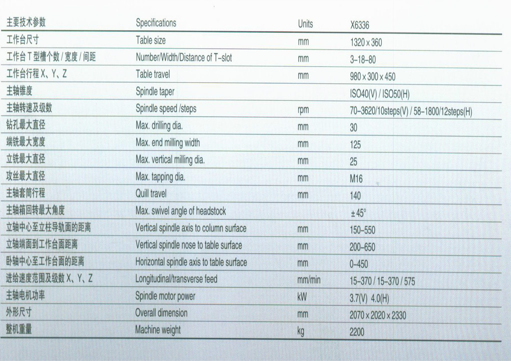 X6336型铣床,主要适用于金属材料和其他一些易加工材料进行铣、钻、镗等多种切削加工。