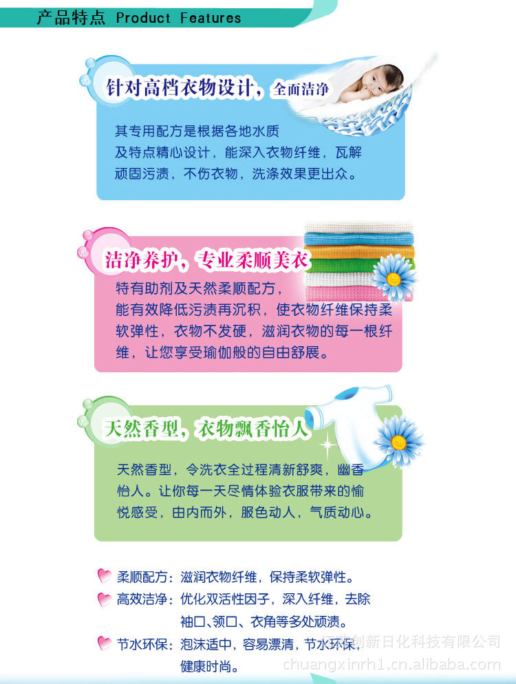 A针对高档衣物设计,全面洁净:其专用配方是根据各地水质及特点精心设计,能深入衣物纤维,瓦解顽固污渍,不伤衣物,洗涤效果更出众。