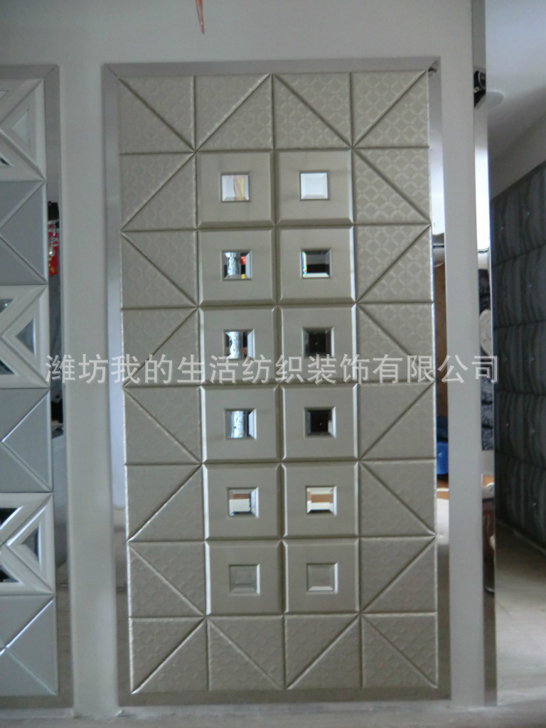 造型特点说明 :硬包模块造型。标准尺寸,边用非标准填充。材料:皮革、镜片。