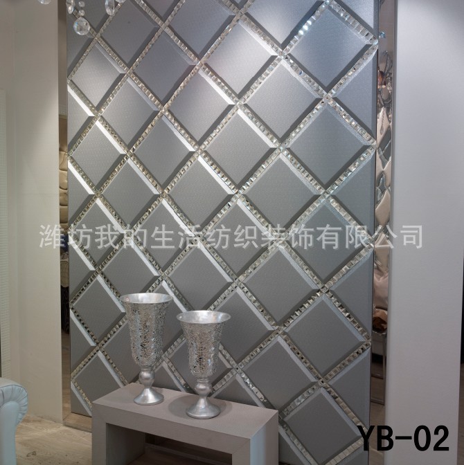 造型特点说明 :硬包模块造型。标准尺寸,要考虑马赛克块数,边用非标准填充。材料:皮革、镜片。