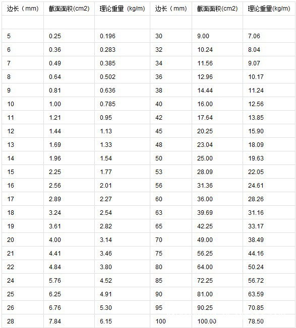方钢理论重量计算公式:边长Х边长Х0.00785=kg/m