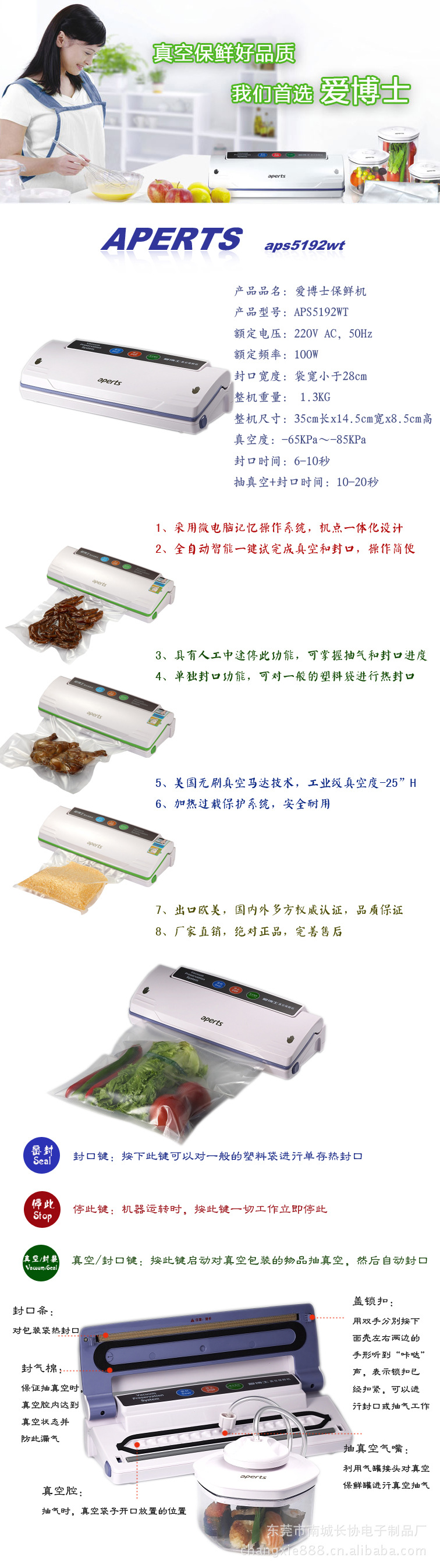 本产品获得多项国家专利。客户遍及欧、美、亚、非、澳等20多个国家和地区。 爱博士家用真空保鲜机、保鲜产品市场前景广阔,居家日用必须品!欢迎广大客户来电详询,爱博士更是您更新潮的财富筹码!欢迎来电订购:联系人:黄小姐:13725880610,QQ:724048189。