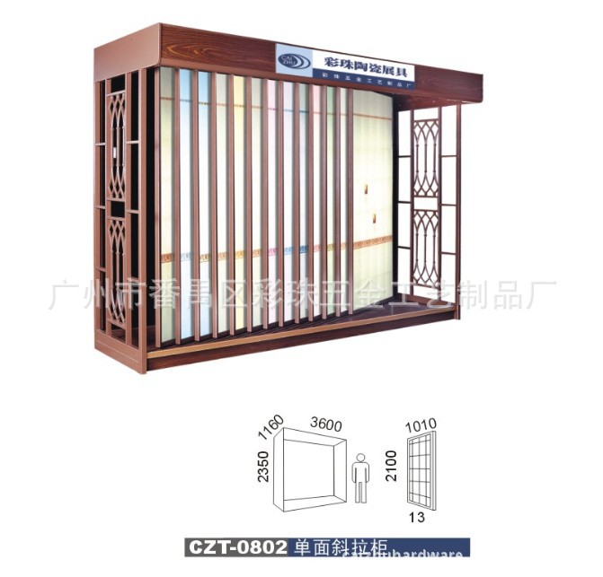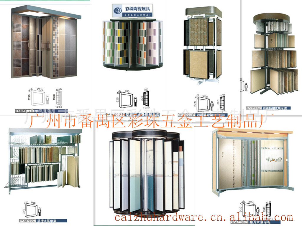 主要涉及行业用途有:瓷砖展示架、地砖展示架、墙砖展示架、马赛克展示架、大理石展示架、洁具展示架、地毯展示架、木地板展示架、天花板展示架、地板展示架、玻璃展示架、铝扣板展示架及资料架等等,水龙头展示架,洁具展示柜,卫浴龙头洁具展柜,热水器龙头展具,各种产品的色板展示柜,精品柜展架,书柜,衣柜等等木制产品柜。也可按客户的要求及尺寸量身订做特殊展具广州市彩珠五金工艺制品厂是一家专业生产经营各种建材展具的企业。主要涉及行业用途有:瓷砖展示架、地砖展示架、墙砖展示架、马赛克展示架、大理石展示架、洁具展示架、地毯展示架、门类展示架、天花板展示架、地板展示架及资料架等等。也可按客户的要求及尺寸量身订做特殊展具。