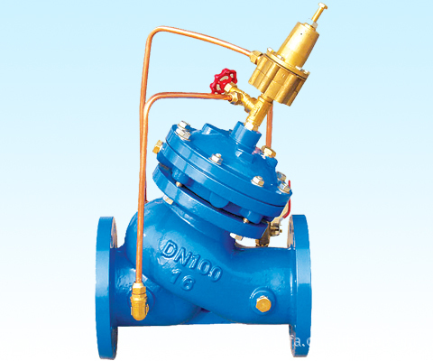 当管道从进水端给水时,水流过针阀进入主阀控制室,出口压力通过导管作用到导阀上,当出口压力高于导阀设定值时,导阀关闭,控制室停止排水,此时主阀控制室内压力升高并关闭主阀,出口压力不再升高。
