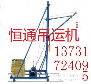 【恒通牌】小型吊运机主要特点1、携带方便本产品体积小、重量轻、小巧玲珑、结构紧凑、携带方便。2、安装简便,将动力装置安放在靠近窗户(或阳台)处,组装支架部分,并将其插入动力装置的底座孔中,5分钟就可安装好。3、吊运速度快,4秒提升1米,10层楼3分钟就可打来回,配用【恒通牌】小型吊运机吊运速度惊人,并且楼层越高优势越大4、适用范围广采用220伏单相电源,用于装璜公司、吊运公司、安装公司、搬家公司、工厂车间、修理部门、仓储库房等多种行业及居民家庭。同时还有广泛的使用场所,除可装于户内,还可安装于房顶,可利用角手架安装于大型工程工地,也可代替龙门吊运于小型建筑工程。能安装防护网、广告牌,也能做楼顶防水现浇工程;能修井修泵还能存放水果、晒粮