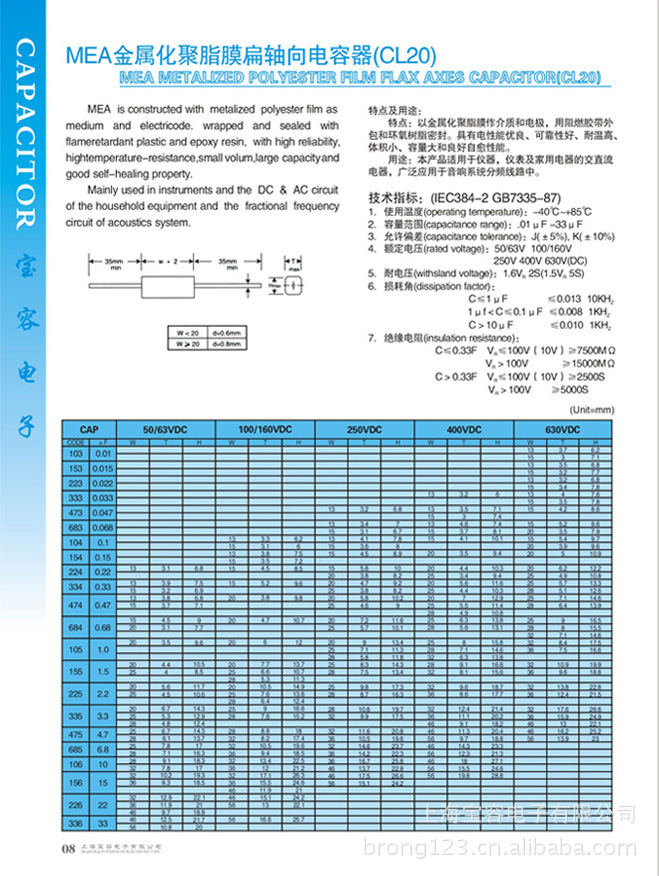产品说明:MEA以金属化聚脂膜作介质和电极,用阻燃胶带外包和环氧树酯密封,具有电性能优良,可靠性好,耐温高,体积小,容量大和良好自愈性能.本品适用于仪器,仪表,家用电器的交/直流电路,广泛应用于音响系统分频线路中.