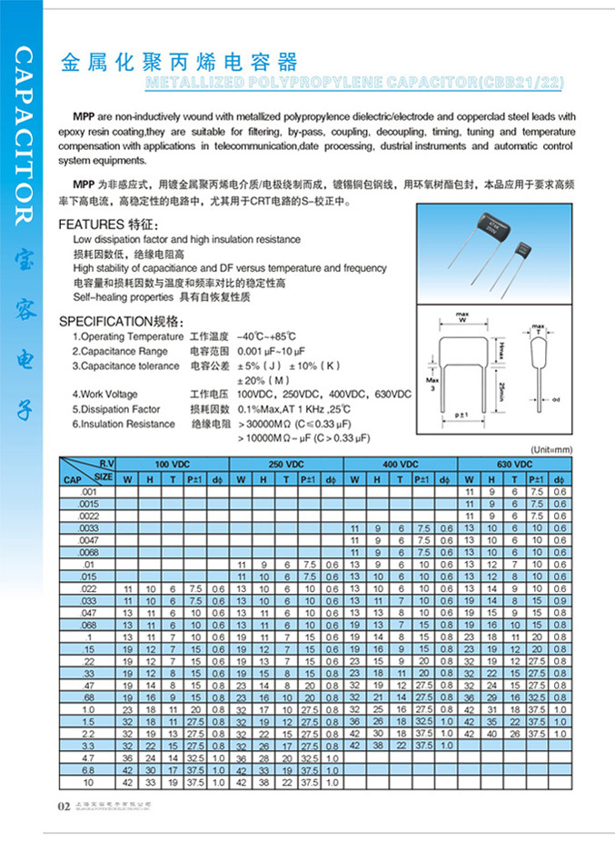 产品说明:MPP是非感应式,用镀金属聚丙烯电介质/电极,绕制而成,镀锡铜包钢线,用环氧树酯包封,本品应用于要求高频率下高电流,高稳定性的电路中,尤其用于CRT电路的S-校正中