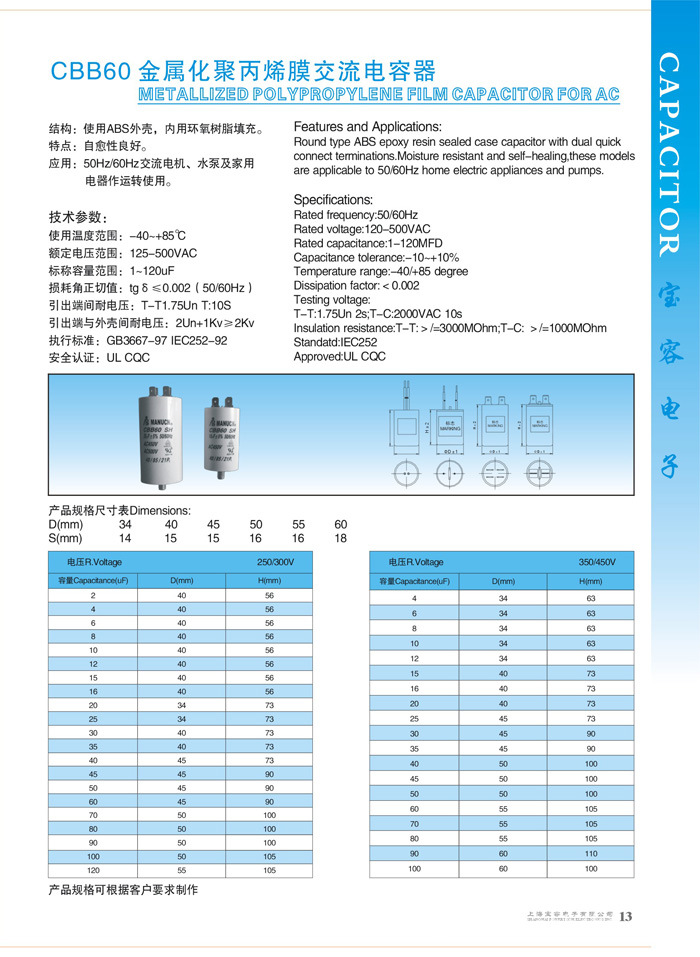 CBB60马达电容器| 产品型号 : | | CBB60-***J***VAC | | 产品规格 : | | CBB60 ***uF ***VAC Φ**x** M8(6-12) L=***mm | | 电容范围 : | | 1uF--100uF | | 电容偏差 : | | ±5%(J),±10%(K), | | 额定电压 : | | 250VAC,300VAC,350VAC,400VAC,450VAC,500VAC | | 损耗因数 : | | 0.2%(20℃ 1KHZ) | | 绝缘电阻 : | | T-T≥3000MΩ.uF | | : | | T-C≥10000MΩ | | 气候类别 : | | 40/85/21 | | 引入标准 : | | GB3667 UL810 |