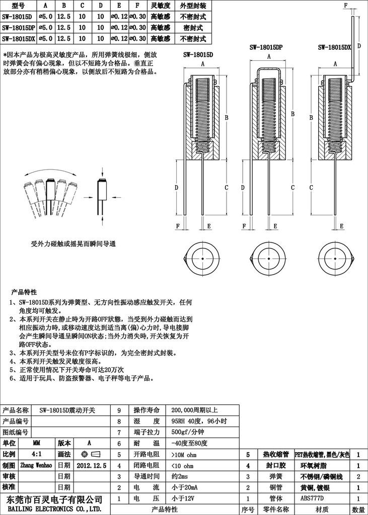 东莞市百灵电子有限公司致力于各种振动开关的开发、设计和生产。经过多年的市场锤炼,产品被广泛用于各种电子电器、仪器仪表、防盗设备、电子玩具领域中,所生产的各系列振动开关产品,则用于需要通过感应不同程度的振动来发光或发声的鞋帮、玩具、运动器材和防盗器材产品的电路结构中。 现型号有:SW-18010、SW-18015、SW-200D、SW-460、SW-460D、SW-58010P、SW-58015