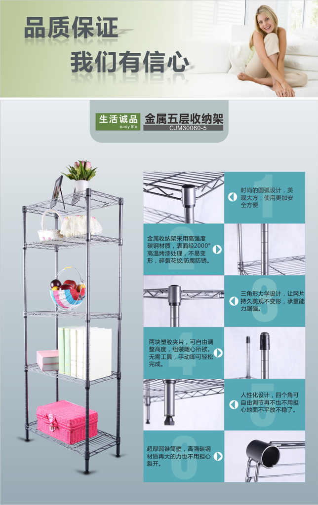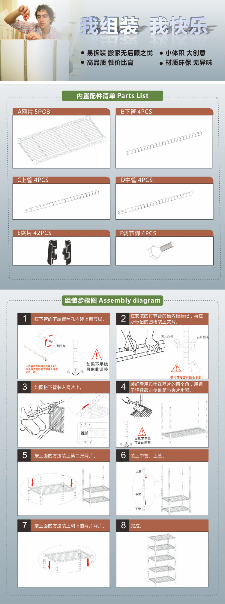 置物架:采用碳钢镀铬网片及支柱组合而成,设计灵巧,装卸简便,洁净亮丽,坚固的碳钢镀铬网片能促进空气流通,减少尘埃积聚,开放式的设计,令储物一眼可见。置物架支柱每一英寸有一沟圈,可随意调节网片高度(每英寸递增减)。可根据实际需要随意组合,可向左右随意延伸(同一宽度)或向前向后随意连接(同一长度)。加上各种配件,可组合成各种功能的产品如加上V型钩、光身管,可组合成衣架;加上方向把手、轮子,可组合成餐车或推车;加上分隔片、侧片,可组合成书架等。 如需要本产品请致电:13910290376 |