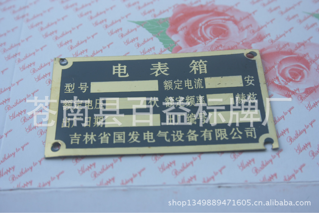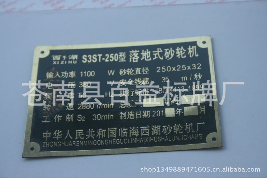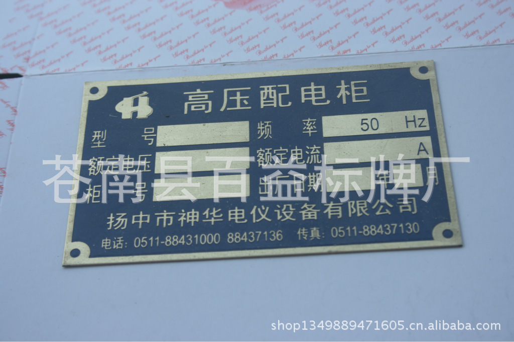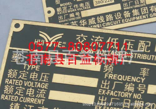 我们以先进的生产设备和优秀的企业文化为指导,以自主研发和独特技术为核心,并拥有一支敬业爱岗、艰苦创业和具有创造设计力的优秀团队为基础,并在设计上不断创新、技术上不断提高、服务上不断完善,一如既往地把高质量产品和高水准的服务提供给广大客户。对客户和社会的“诚信”是我们的保证,我们坚持以“信誉第一 诚信为本 客户至上 质量保证”为核心为企业健康持续的发展提供了信誉保证。 【 以质量求生存,以信誉求发展】是我们经营宗旨。愿以此宗旨和广大客户共谋发展为新老客户提供优质的产品,高效的服务,欢迎来样、来电、洽谈业务。本厂技术力量,设备机器实力雄厚。企业拥有电脑数控模具雕刻机.拥有1200吨、300吨、200吨的液压机、摩擦压力机、冲床、热室压铸机等机器、设备30多台。设冲压车间、制模车间、液压车间、抛光车间、镀金车间、烤漆车间、包装车间等。能够冲压高精密度的各类金属件及精密度的模具。拥有国内最先进的生产设备制作各种铜牌、铜字、铝牌、交通标牌、电力指示牌、道路指示牌、门牌、反光牌、电信线路牌、禁止指示牌、警示牌、镐光铝牌、磨光铝牌、高光标牌、腐蚀铝牌、铭牌、标牌、不锈钢牌、堆金牌、钛金奖牌、木托奖牌、不锈钢标牌、双色金奖牌、镀金牌、铝砂牌、镀金商标、镀银商标系列是具有相当规模生产设计加工企业、在当地标牌产业生产加工上处于领先地位。 询价说明1. 以上样品及价格仅供参考,请客户务在此方面太过计较,未询问拍下者,有权不发货 2. 本厂生产:各种金属标牌。3. 材料:铝、铁、铜、锌、不锈钢等。4. 生产工艺:压铸、喷漆、涂漆、高光、水晶滴胶、腐蚀、印刷、贴 金、电镀等。5. 生产时间:一般为7天-10天,如有特殊情况,最低5天可完成生产。6. 如有其它或特殊要求,请与客服联系。 注:店内产品是本厂为客户个性化设计定制的,仅供参考,产品及商标所属权为产品公司所拥有,如您需要定制产品,请提供设计图样或实样以及详细的文字说明。 产品适用范围机械类:砂轮机,电机,发电机,包装机,印刷机,柴油机,等各类机械电器类:液晶显示器、电视机、电视机机顶盒、音响、DVD、功放、空调、冰箱、洗衣机。家具类:书桌、沙发、橱柜、保险柜等。交通类:摩托车、电动车、自行车、轿车客车等。其它:外包装盒、数码产品、电子设备、机械设备、安全门、路牌指示牌、门牌号码牌、等产品。 厂家介绍 温州苍南百益标牌厂始于1998年,本厂至今已有十五年。拥有丰富的标牌制作加工经验。秉承质量至上,品质保障,价格合理,对客户负责,为客户提供便利的服务理念。一切生产流程皆有厂长亲自督工完成。必要时安排加班加点完成订单。竭诚欢迎新老客户前来咨询洽谈。0577-80807711 80808866 24小时热线13356157226