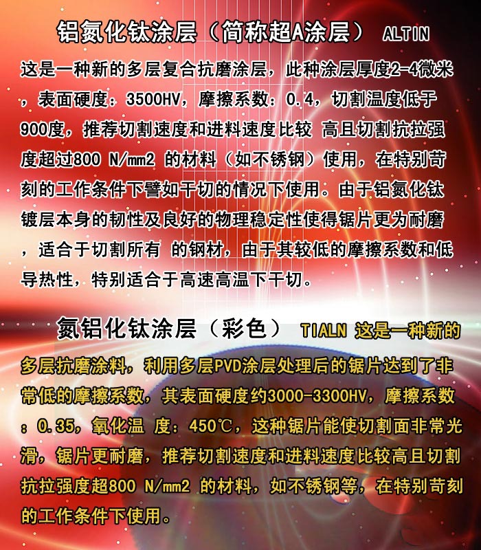 不锈钢专用高速钢锯片有M42七彩及super-A两种型号,M42七彩用于硬度较高的铜材及不锈钢加工,SUPER-A,用于硬度较高的材料切割,尤其201等不锈钢,也适合难切材料,实心材料加工
