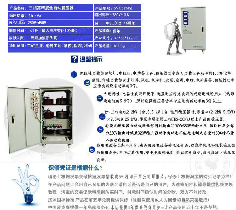 3、 为保证稳压器正常输出电压、电流,减少线路功率损耗,请合理选择输入、输出导线截面积,一般选用铜芯导线接5A/mm2计算,若选用铝芯导线则按2.5A/mm2计算。联系厂家电话:13867772597