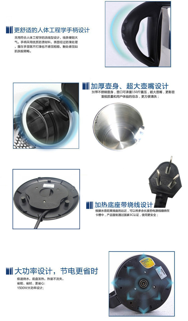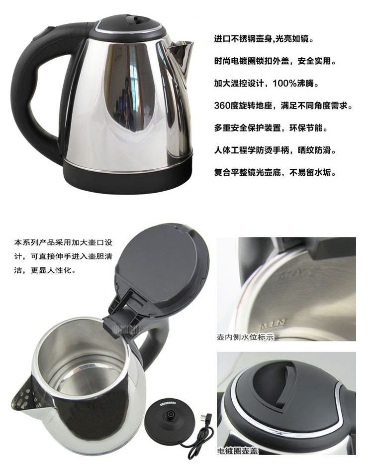- 时尚新简捷的人性化设计高抛光不锈钢壶身光泽如镜面,新颖防尘盖设计,壶体与电源线底座分体式,360度旋转,电源线可收藏设计,存放更方便。