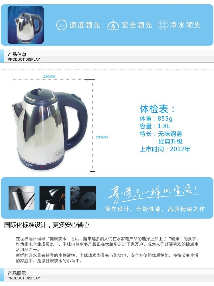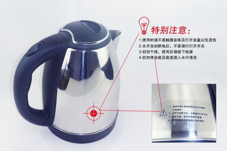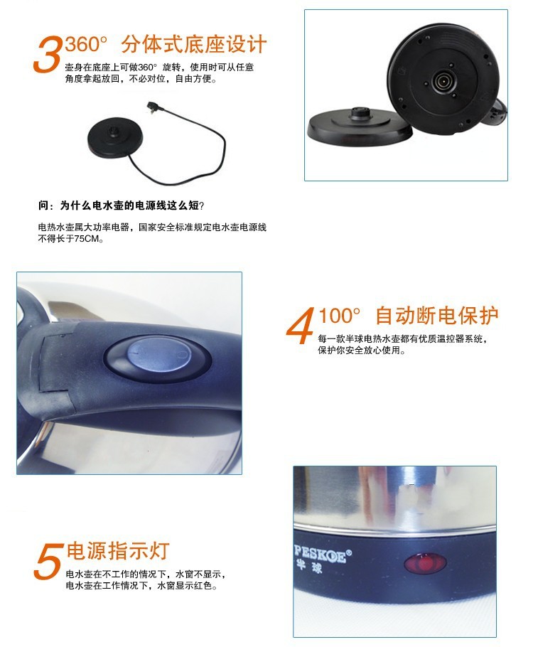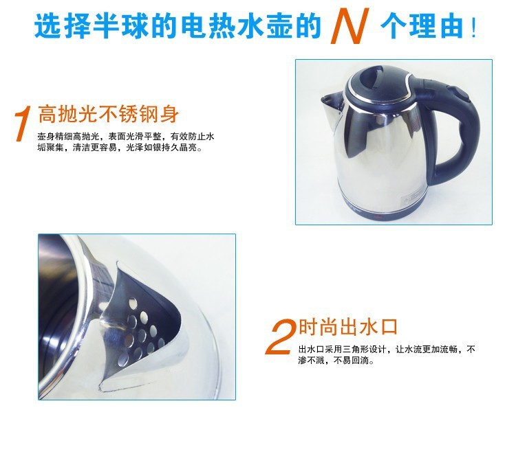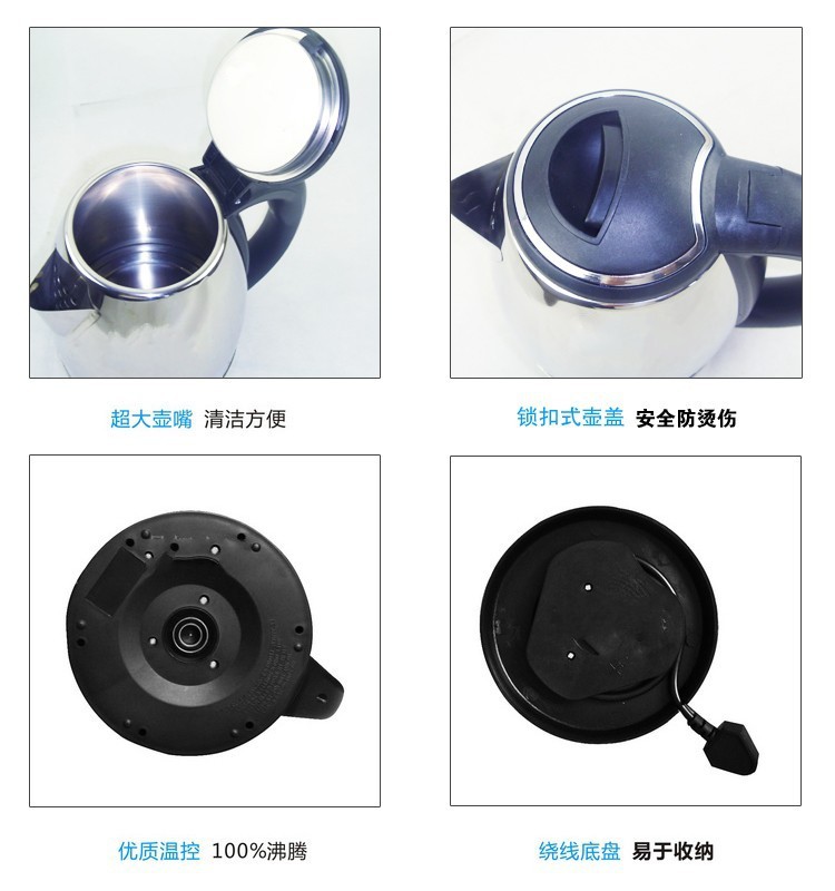 - 时尚新简捷的人性化设计高抛光不锈钢壶身光泽如镜面,新颖防尘盖设计,壶体与电源线底座分体式,360度旋转,电源线可收藏设计,存放更方便。
