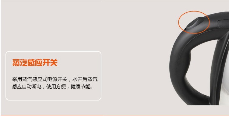 8、人性化把手设计,接通电源开关在把手之上,平底加热新工艺,彻底消除传统发热管易结水垢之缺陷,清洗方便。
