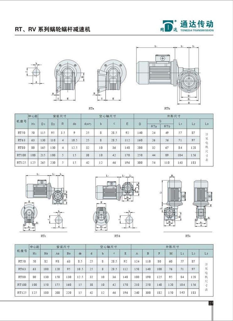 安装尺寸见下表,请根据不同的用途选用不同型号(例:RTC100Y-2.2-50-DZ-2号),具体参数可参考我公司网站,也可来电向我公司索取产品手册,我们会真诚的为您服务。 同心协力,达成梦想——“同达”牌减速机,信誉+品质=您的选择。
