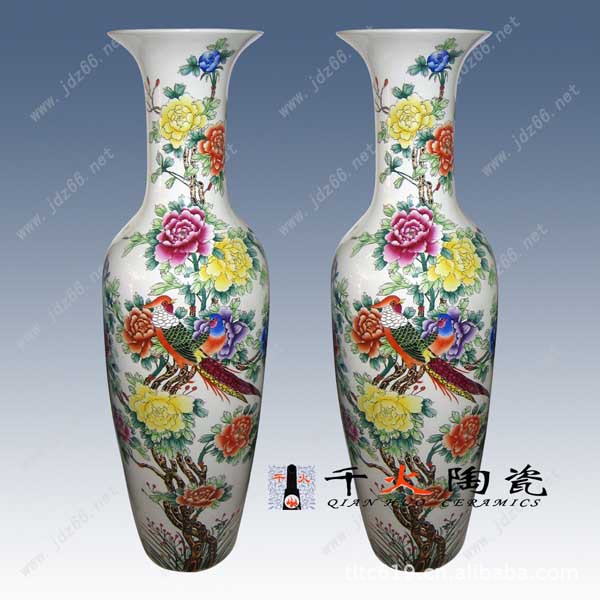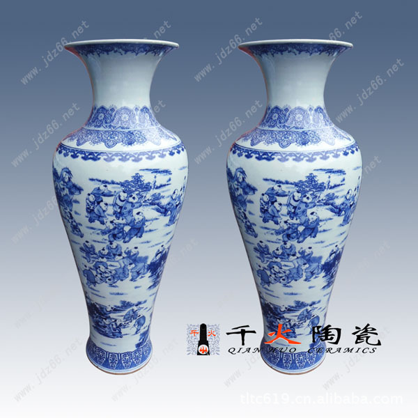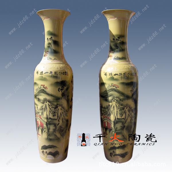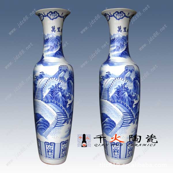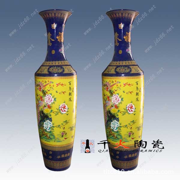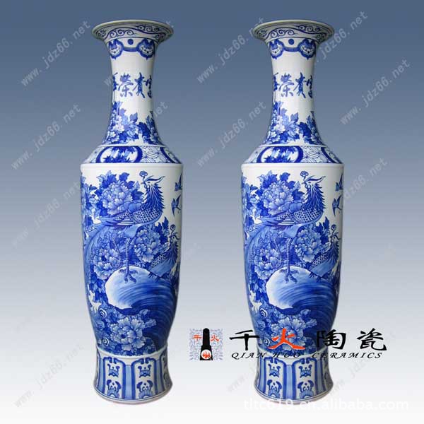 陶瓷大花瓶多用于大厅、门厅、客厅等摆设,主要用于开业礼品,大楼建筑落成、工程竣工开业、奠基典礼、酒店宾馆陈设、企事业单位乔迁、周年纪念 、学校校庆、搬迁新居等。有特殊需要,在大花瓶身上可烧制LOGO、公司名称、人名、赠言,纪念用语,年月日等。全手工绘制,高白泥手工拉胚,高白釉上底色。陶瓷大花瓶要经过淘泥、摞泥、拉坯、修坯、绘画、上釉、烧窑、成瓷等近七十道工艺才能制做完成。