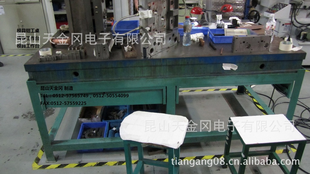 美女现场安装工作桌,昆山天金冈定做钳工桌,载重1000KG工作桌