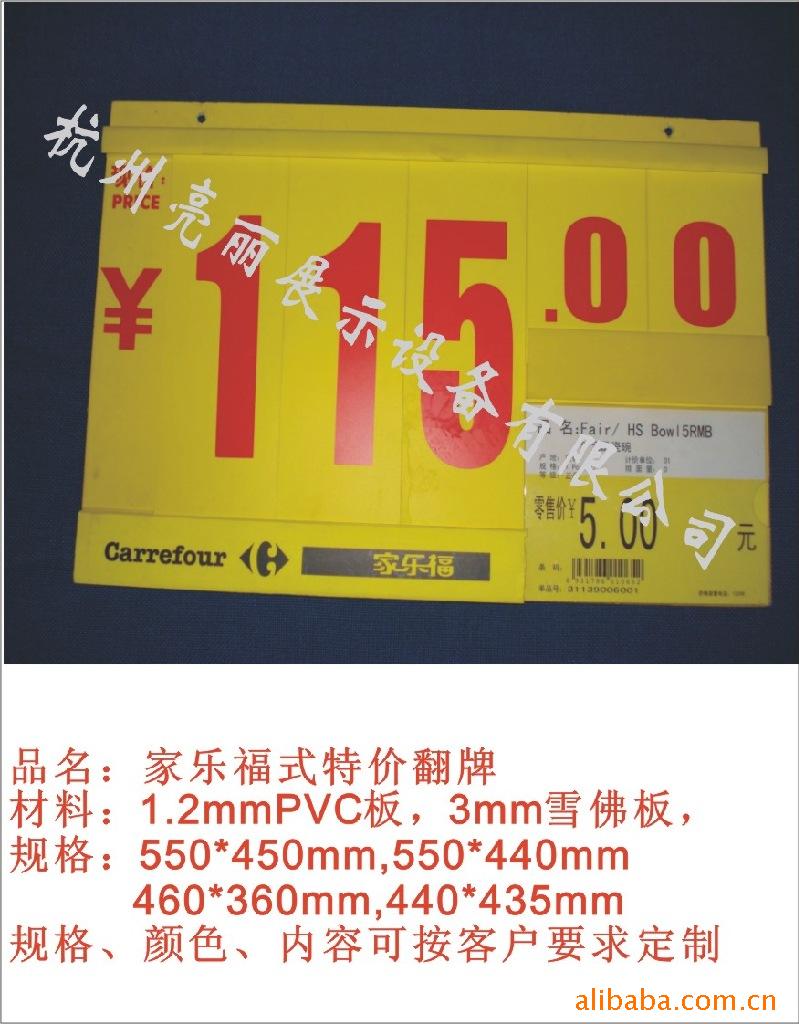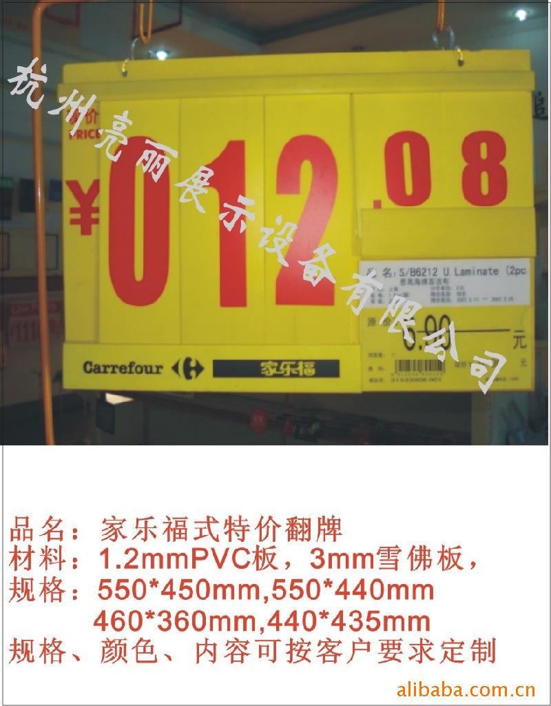 品名:可转动数翻牌材料:PVC片价格:根据规格而定规格:500*380mm、475*360mm、415*310mm、340*300mm颜色:白底黑字、白底红字、黄底红字、黄底运黑字用途:用于超市里里广告牌,标示产品单价的促销。