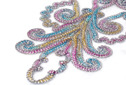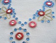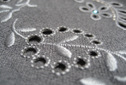 雕孔绣装置安置在每一平绣机机头上的第一针,雕孔刀便按打版时预设的资料在布料上雕出小孔,加以平绣包边,增添刺绣图案的变化。 | | | |